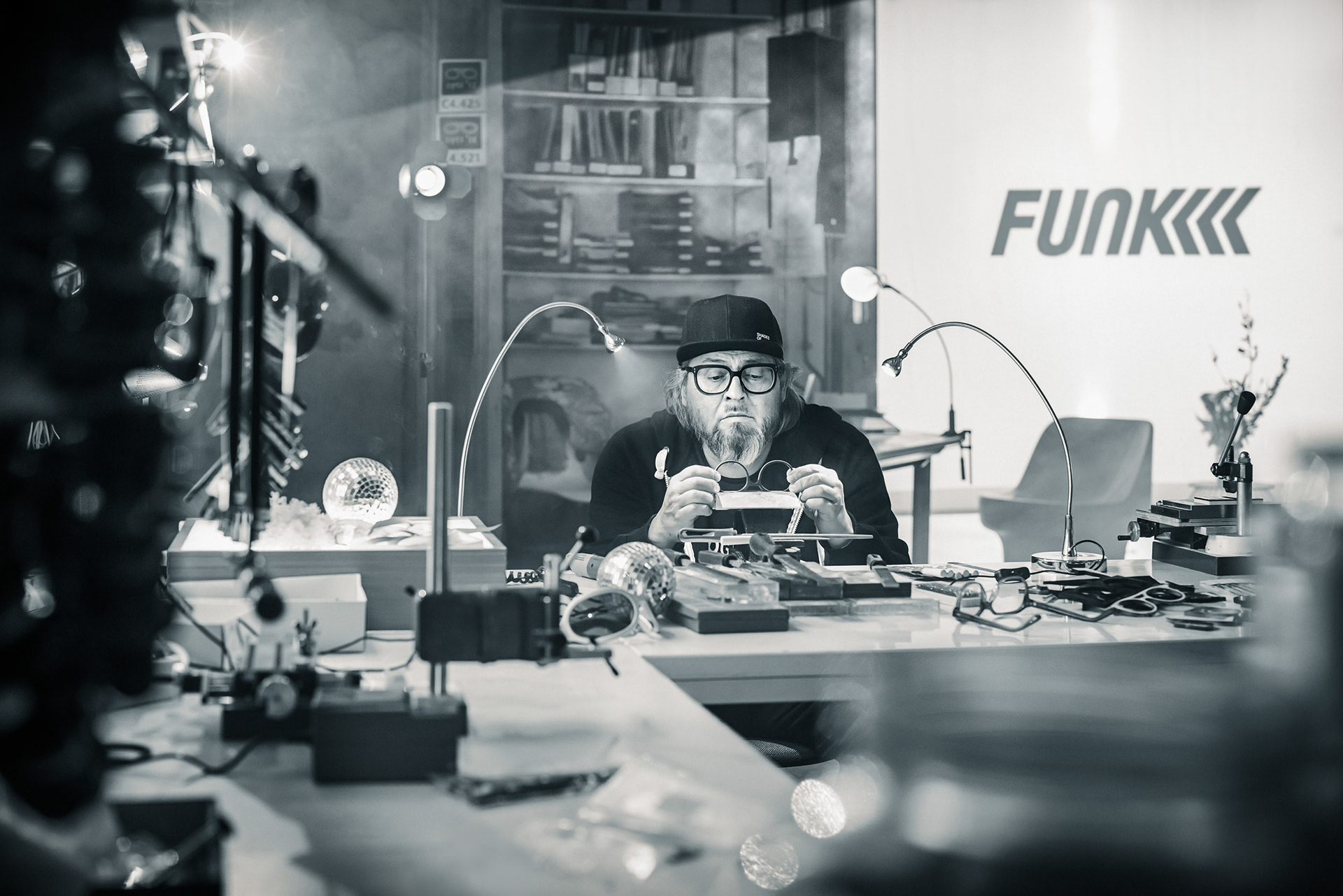 Heute ist FUNK im bayrischen Kinsau eine der letzten echten Brillenmanufakturen in Deutschland. Dort entstehen Brillen nach traditioneller Handwerkskunst mit hohem Qualitätsanspruch und nachhaltiger Prämisse. Dieter Funk und seine Frau Sashee Schuster verwenden für ihre Kollektionen z.B. Recycling- oder Vintage-Acetat und Naturmaterialien. Fotos: FSK Fotografie, München